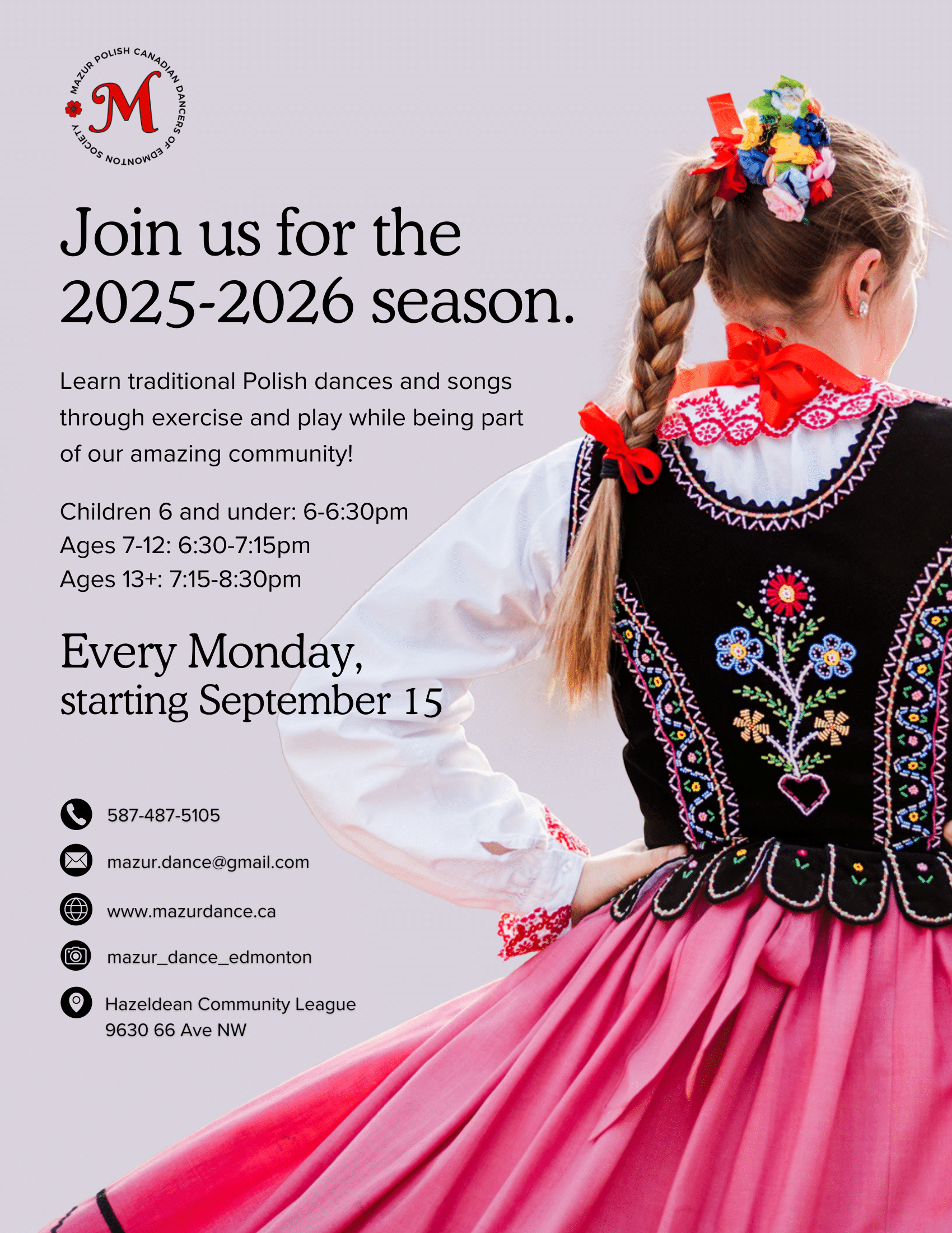 Mazur Polish Canadian Dancers of Edmonton Society was established for the purpose of providing a creative and enticing learning environment for school age children and youth.  To lively traditional Polish music, children are taught the intricate dance steps and choreography of traditional folk dances from various regions of Poland.